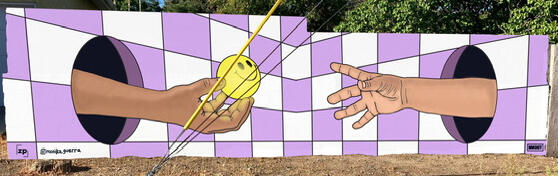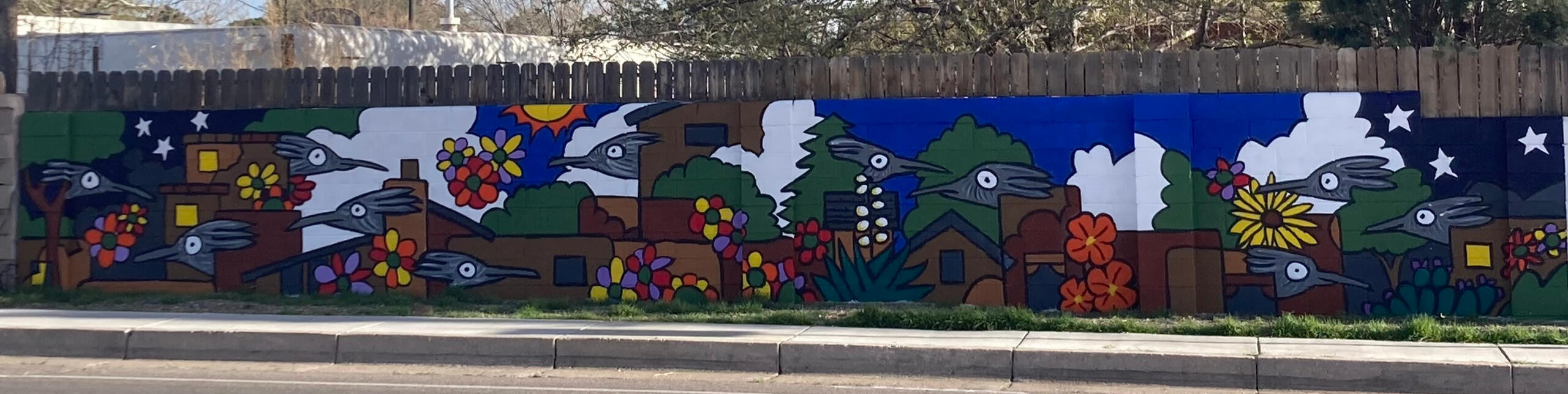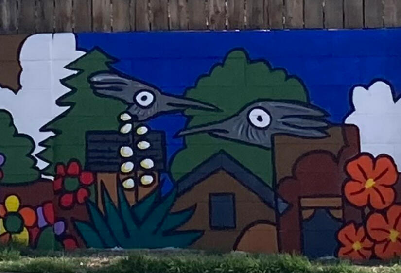 Andy Young's "The Neighoors" was one of the first two murals to be painted on a previously unadorned wall, often filled with graffiti. A close up of Andy's mural gives you a glimpse of just who those neighbors are. Andy's day work is first/second graders. But you can find his art work in galleries from Albuquerque to Madrid. [email protected]