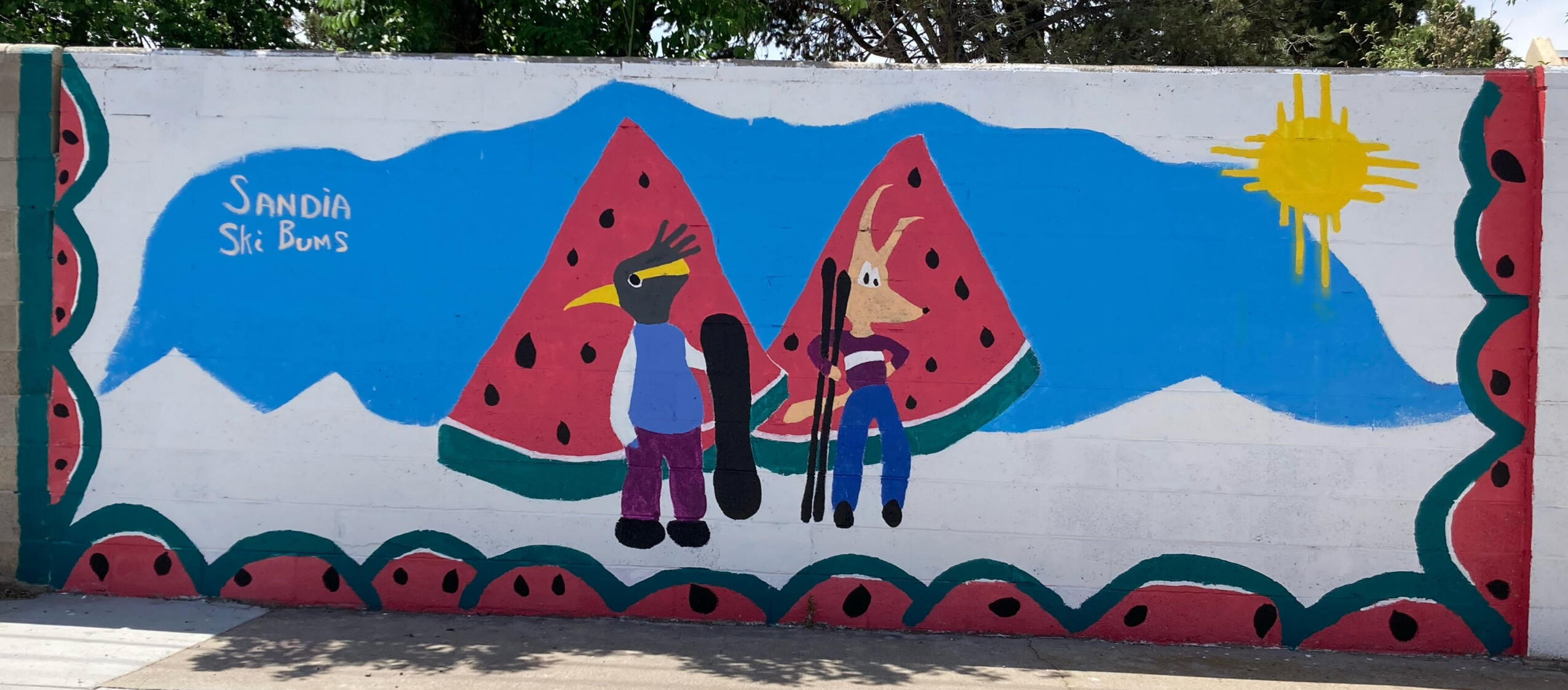 "The Sandias" mural puts the watermelon mountains right here on our street. The iconic Sandia profile has been captured by Isaac Burleigh and Kiran Bhail. Residents of the McDuffie neighborhood, Isaac is an experienced community arts artist. Isaac and Kiran had a large canvas to fill and did an amazing job of bringing the Sandia energy to our neighborhood.