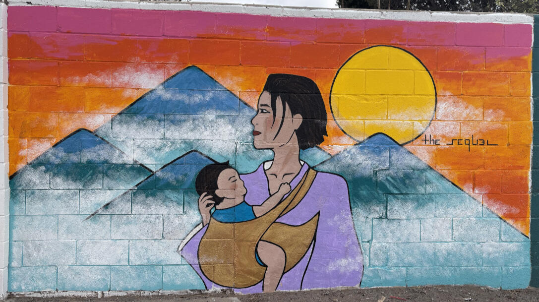 "The Sequel" is a vibrant and tender mural that captures the timeless essence of a mother's love and the unfolding story of generational continuity. Set against a radiant backdrop of the Sandia mountains and a rising sun, the image of a mother holding her child evokes protection, nurture, and hope. The child, wrapped close in a gold carrier, symbolizes the beginning of a new narrative -- one born from love, destined to shape the future. In this piece, the artist honors the quiet strength of motherhood and reminds us that in every child's life, the future is not only imagined but actively brought into being. Vivianne Chang, a psychiatry resident at UNM, is a self-taught artist. Vivianne explores creativity as a personal expression and healing.