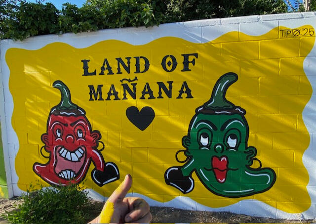 "Land of Mañana" means to live in the present moment, whatever worries you have, it's for tomorrow. It is the whole idea that we never know our last day and to appreciate the now. Hold your mama's hug for a while more, kiss your friend's cheek a little longer, appreciate the beauty of now and romanticize the little moments that seem small now, but that you will remember forever. The mural was created by a Hispanic with only love for my culture. A phrase that my abuelito, mom, father, everyone used. Hasta manaña. Manaña será otro dia. Para manaña. Tierra de manaña.