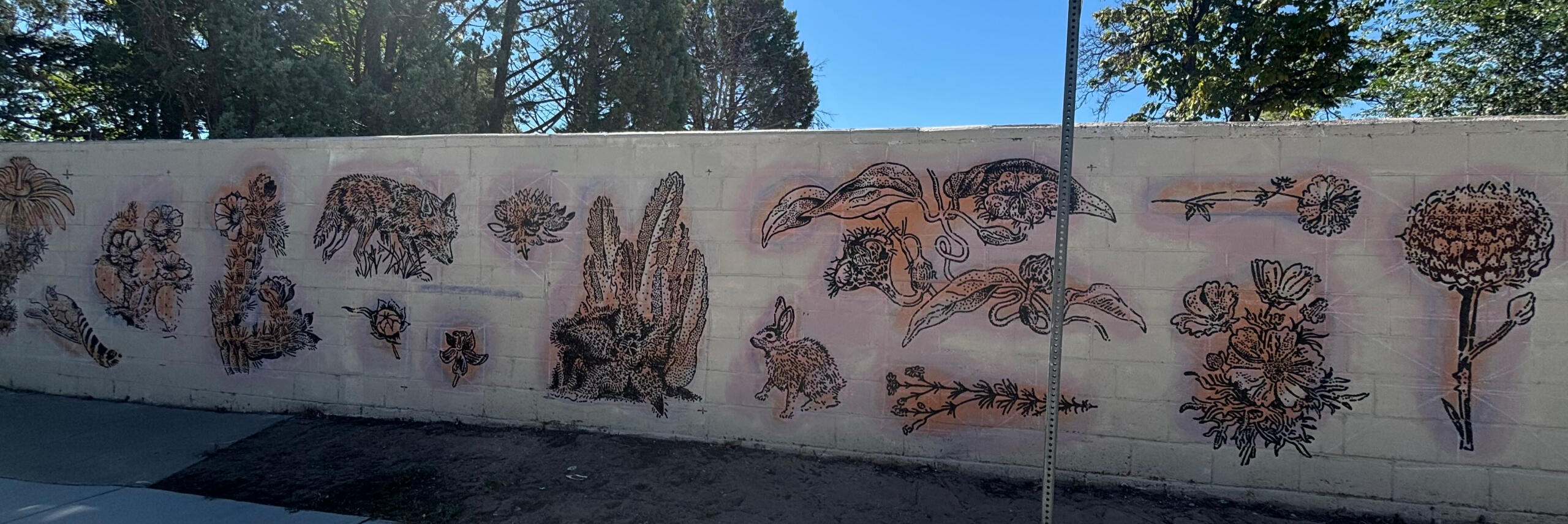 The McDuffie-Twin Park Neighborhood Association dreamed of murals on the south walls of Constitution Avenue from east of Carlisle to Avenida Manana. The hope was to create a corridor of color and whimsy for the enjoyment of all driving, biking or walking by these walls. We hoped to provoke a smile and a sense of place. (As well as replace a patchwork of paint splotches over tagged/graffitied areas and maybe slow down traffic!)In the Spring of 2024 we contacted neighbors whose walls would be painted for their participation, announced a theme for submissions for mural ideas, and started fundraising for the project.